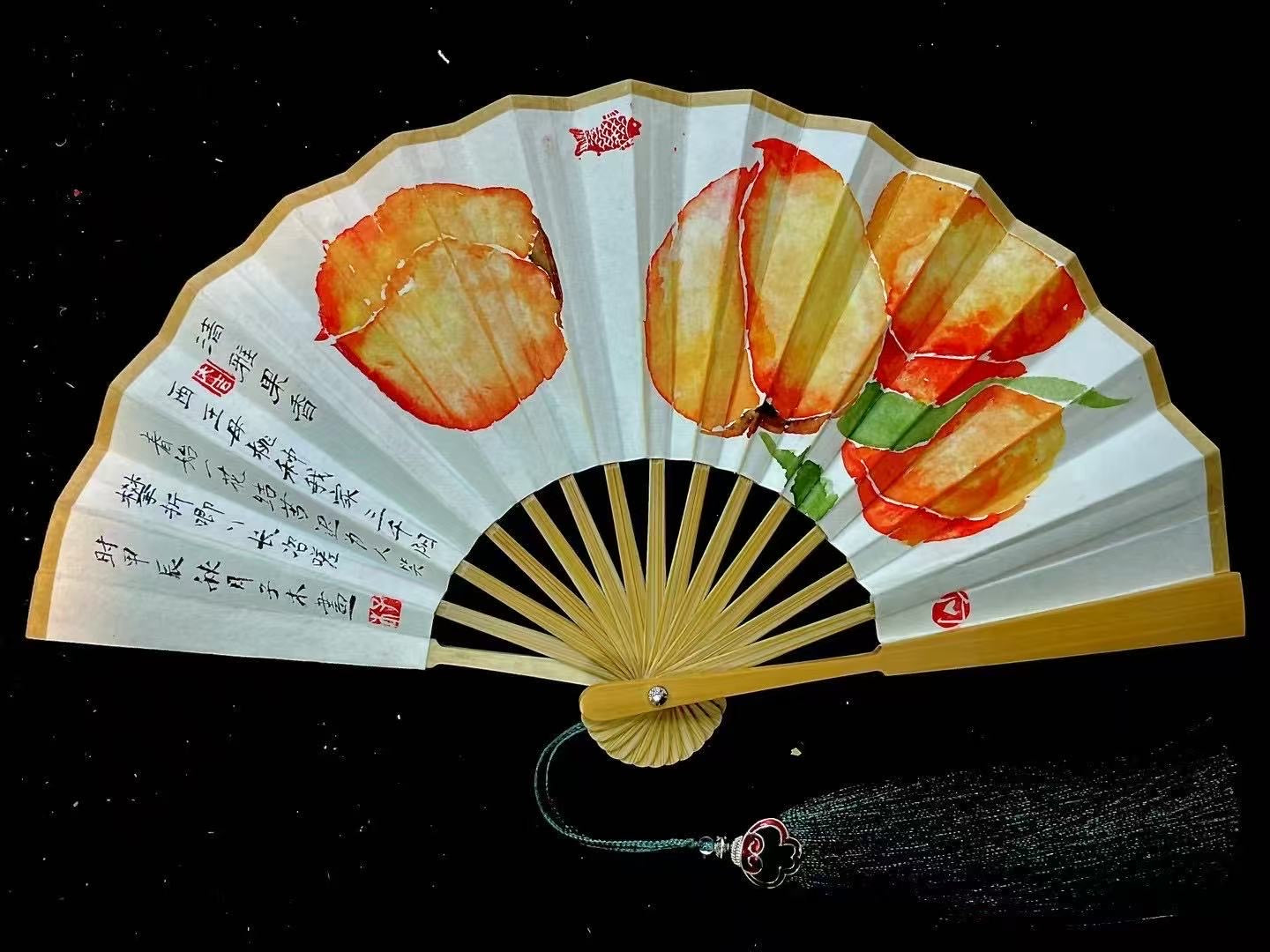 Painted in glowing hues, this fan celebrates quiet beauty and renewal.