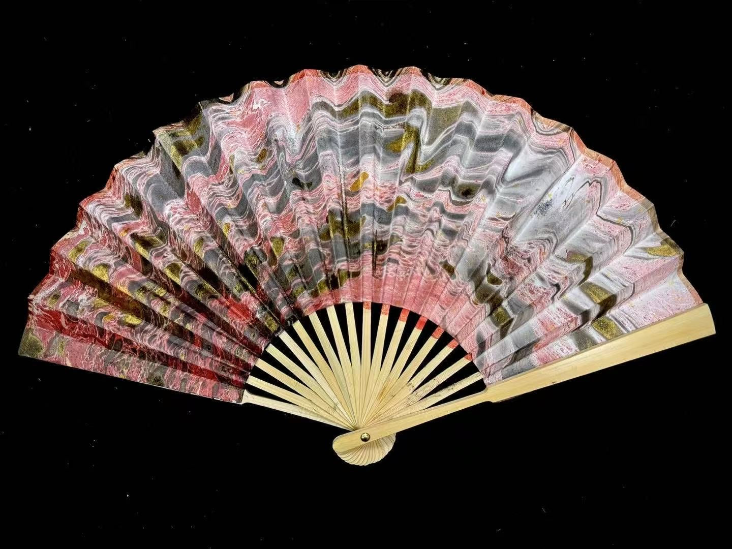 Soft grey meets petal pink—this fan whispers elegance and quiet grace.